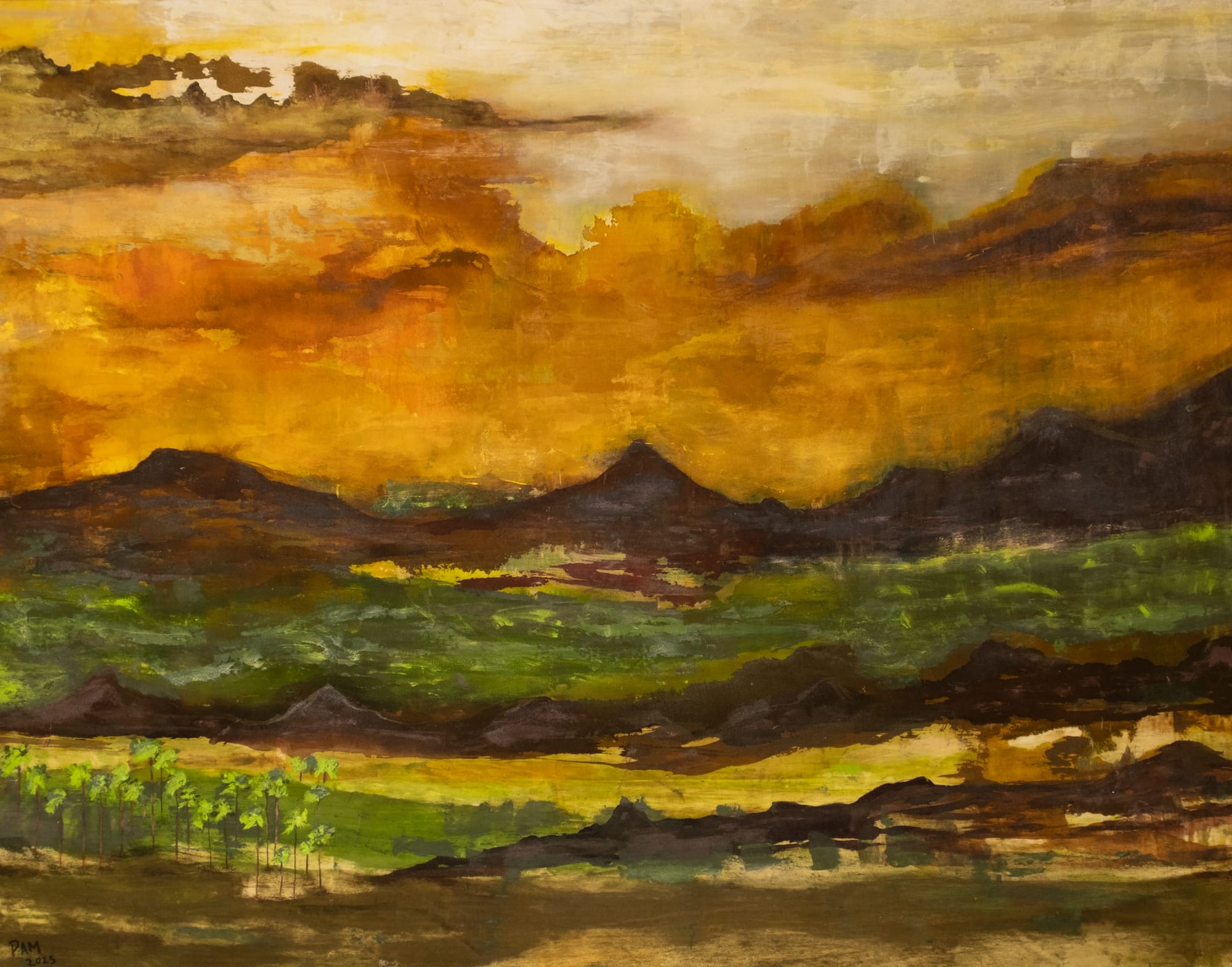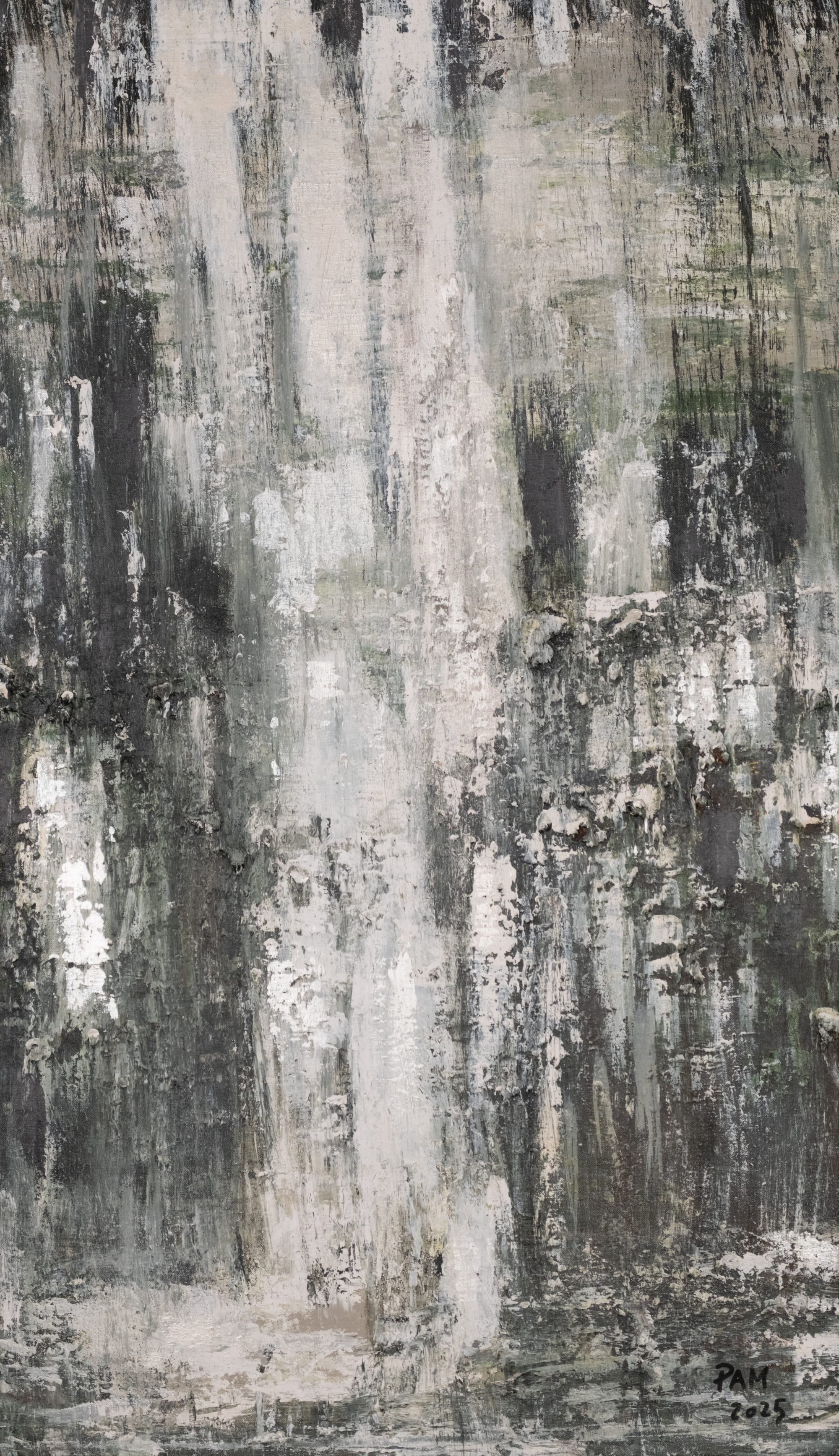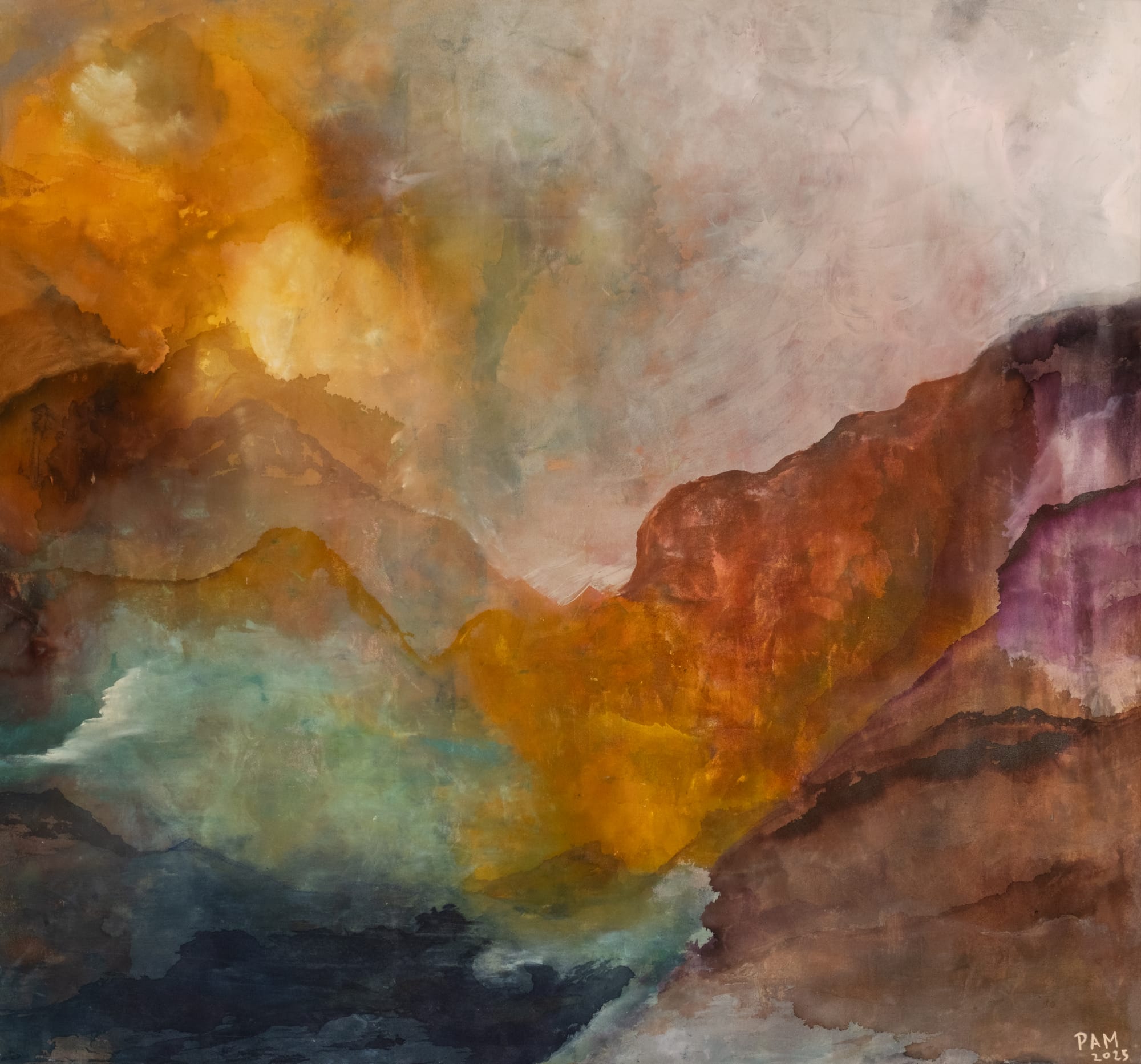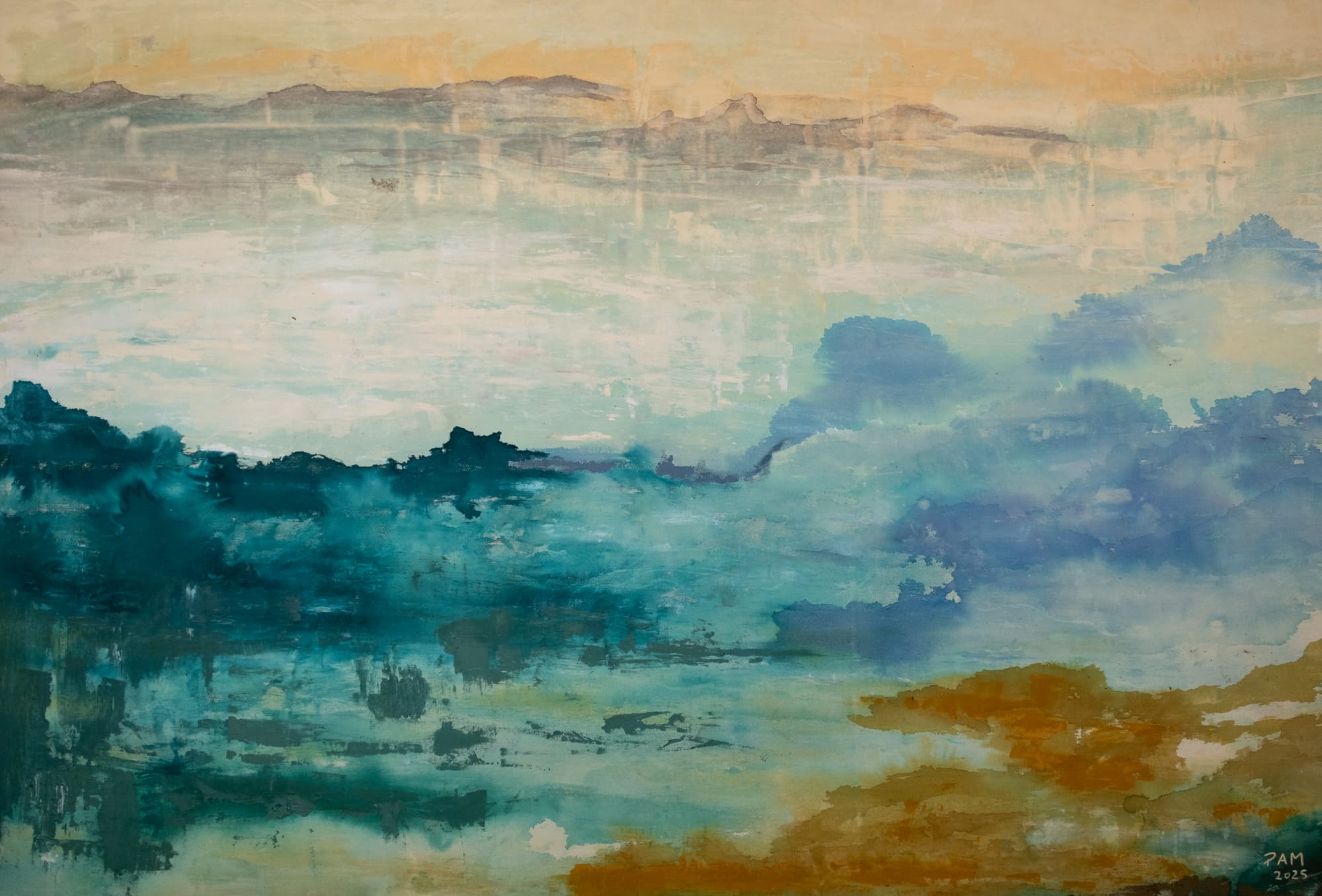 Camadas e sobreposições de tintas revelam paisagens - reais e imaginárias, que transitam entre o terreno e o etéreo, entre o consciente e o inconsciente.